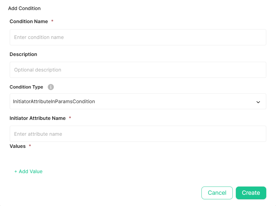 Condition Type (required) - Select the condition type to use. Currently, the only type available is InitiatorAttributeInParamsCondition, which checks if a user's attribute matches specific values.