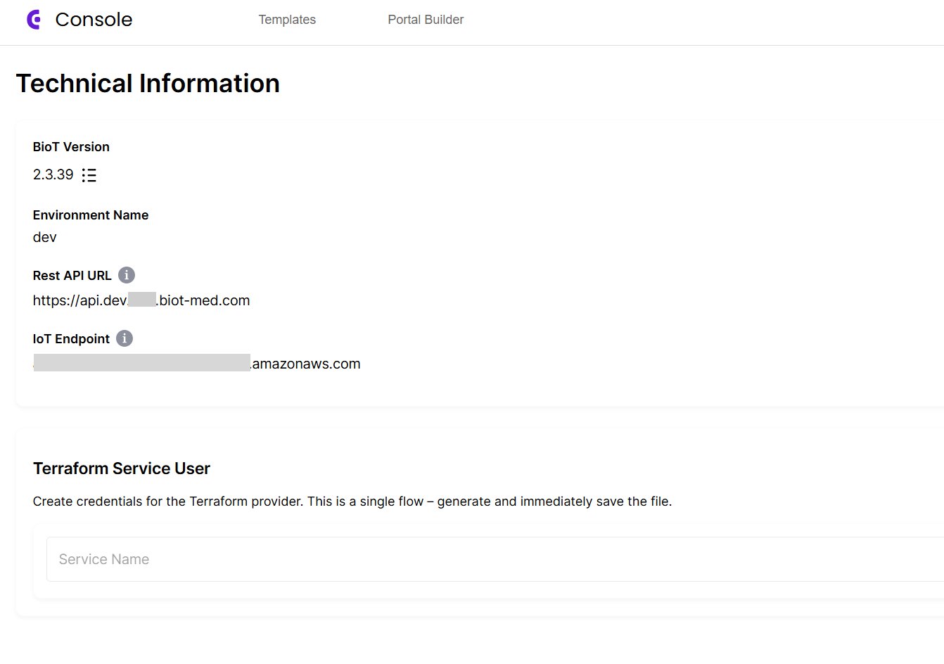 The following endpoints are displayed in the Technical Information page for connecting portals and devices to your BioT environment: